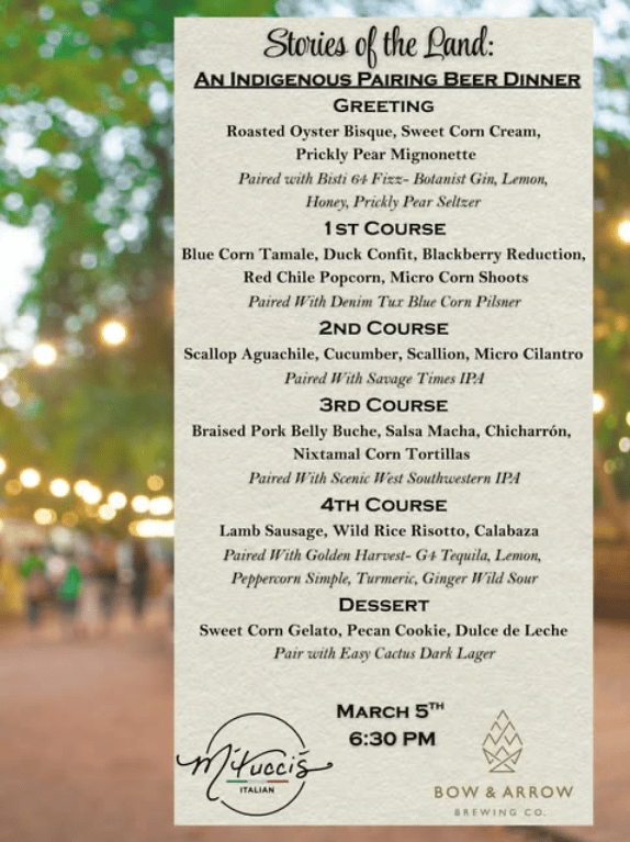 Join us at M’tucci’s Italian on March 5th at 6:30 PM for an unforgettable Indigenous Beer Pairing Dinner inspired by the rich culinary traditions of North & South America. From blue corn and red chile to, prickly pear, each course honors the ingredients and stories rooted in this land, thoughtfully paired with bold, local brews from Bow & Arrow Brewing Co.