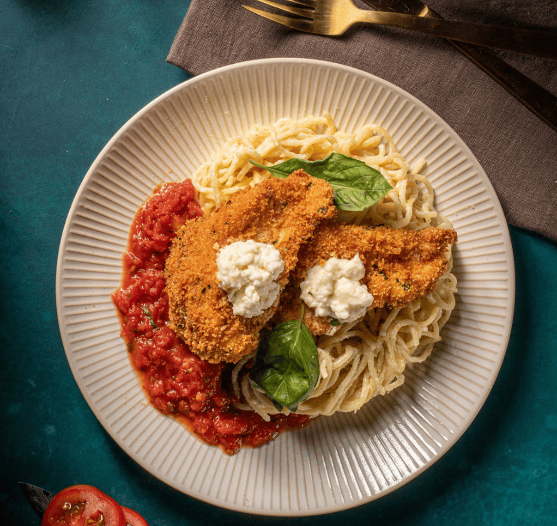 Crispy Breaded Chicken Breast, Melted Creamy Mozzarella, N/fuccis-Spicy Marinara, Cacio E Pepe Spaghettini