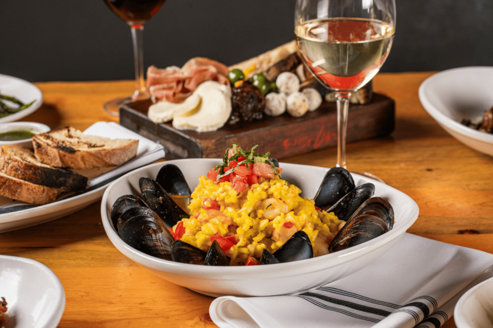 Aged Carnaroli Rice, Mussels, Asparagus, Sautéed Shrimp, Salmon, Saffron-Dijon Brodo, Tomatoes, Basil